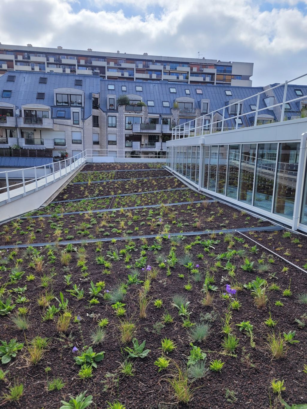 Conçu dans une démarche « Biodivercity » le projet transforme un milieu urbain minéral pauvre en une composition foisonnante de « micro-milieux » inspirés des espaces naturels typiques du bassin Parisien. Les palettes ont été adaptées aux variations de substrats et de pleine terre qu’offre l’implantation ingénieuse du bâti. Les végétaux sont finement disposés pour constituer des bosquets et prairies attrayantes pour la faune locale. Une terrasse est ouverte au public et offre des bancs et agrès sportifs en relation avec les activités du stade attenant. La palette indigène est adaptée à l’accueil du public, excluant les végétaux toxiques et fortement allergènes.