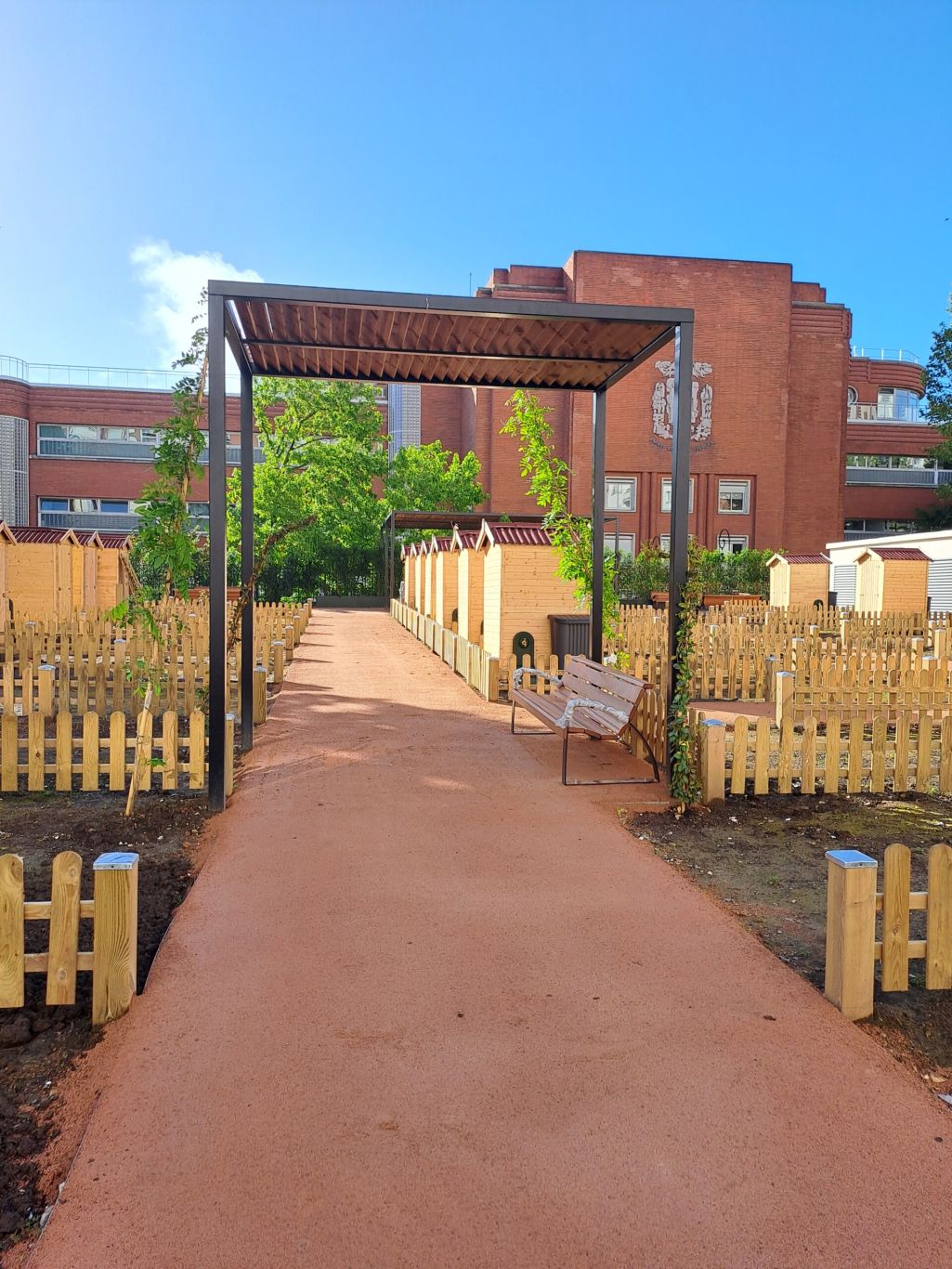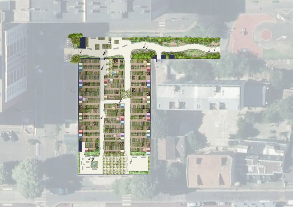 L’entrée du jardin et les murs d’enceinte sont requalifiés et végétalisés de manière à offrir une atmosphère accueillante et en cohérence avec les autres jardins familiaux de la ville de Puteaux. La première séquence du jardin accueille des bacs potagers composés de plantes aromatiques et comestibles, et permet d’accueillir les enfants des groupes scolaires situés à proximité dans le cadre d’ateliers pédagogiques. La seconde séquence, est composée de 32 parcelles à cultiver, desservies par des petites allées et délimitées par des clôtures basse en bois pour maintenir les perspectives visuelles. Chaque parcelle est agrémentée d’un cabanon et d’une alimentation en eau. Enfin, la partie Sud du site est aménagée en jardin de contemplation où les résidents peuvent se retrouver et se reposer dans un cadre apaisé et chaleureux. Une pergola y prend place et apporte ombrage et fraicheur en été.