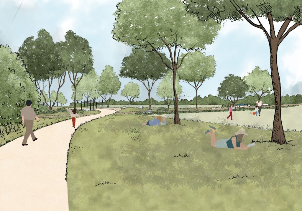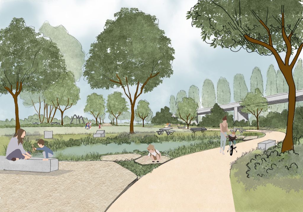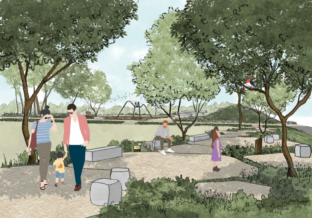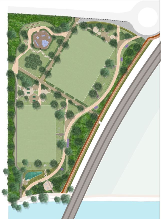 Le projet vise à transformer une friche d’infrastructure en un parc paysager aux multiples activités sportives et ludiques lové dans un écrin paysager. Deux grandes prairies structurent les cheminements pour une pratique sportive libre et intergénérationnelle. Un sentier de la biodiversité anime le site et sensibilise le public aux enjeux de la faune et de la flore locale. Enfin, les itinéraires permettent de relier, à pied comme à vélo, le chemin de halage aux complexes sportifs tout en inscrivant les prémices d’équipements futurs. Ce programme ambitieux s’intègre dans une démarche vertueuse de protection du patrimoine arboré existant et s’appuie sur une démarche de renaturation du sol existant pour limiter l’impact environnemental du projet.