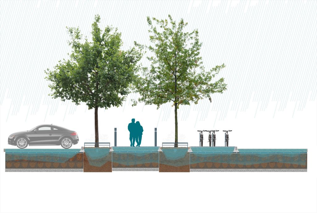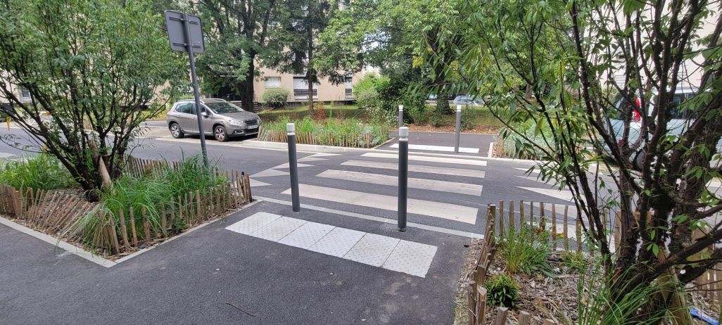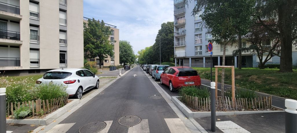 Le projet vise à améliorer les itinéraires piétons et les rendre lisibles et accessibles à tous. La modification du schéma de circulation a permis de créer 284 places de stationnement sur l’espace public, tout en créant des «bandes servicielles» destinées à la gestion des OM, à l’implantation d’attaches vélos et la création de massifs plantés. Par une analyse fine des réseaux en sous-sol nous sommes parvenus à intégrer un alignement d’arbres sur chaque rue afin de pérenniser le paysage arboré, identitaire du quartier. Des cellules «rootspace» d’Urbencea sont mise en place, permettant pour chaque arbre de disposer de 24m3 de terre végétale. Enfin, le projet a également fait l’objet d’une démarche de réemplois sur le mobilier existant, portée conjointement avec Cycle Up.