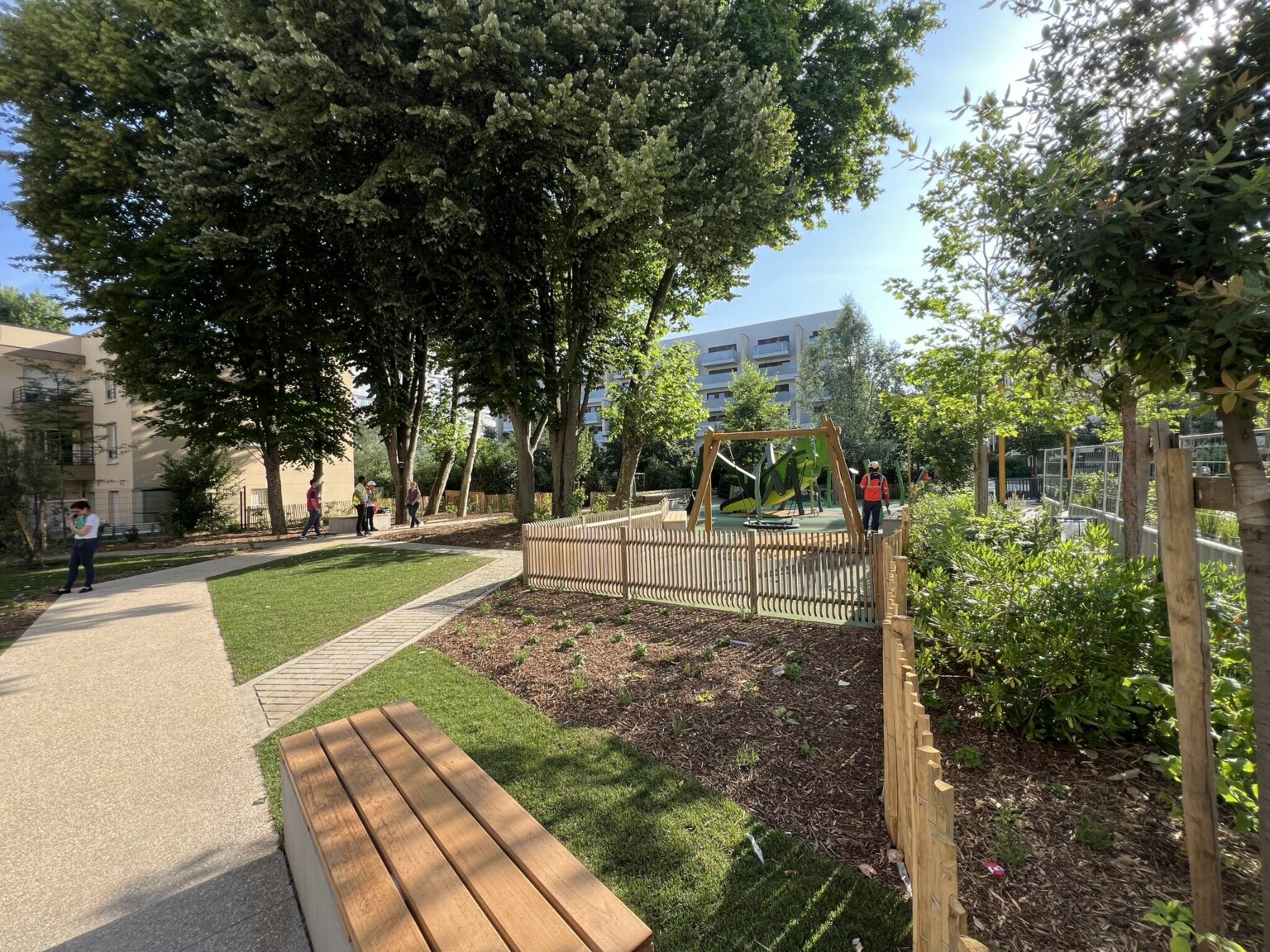 Composé d’une aire de jeux étendue, d’un jardin de senteur, d’un solarium et d’une petite promenade dans un bosquet existant, ce jardin a été réalisé en un temps record puisqu’il a été conçu au 1er trimestre 2025, réalisé au second trimestre 2025 et inauguré en juin dernier.